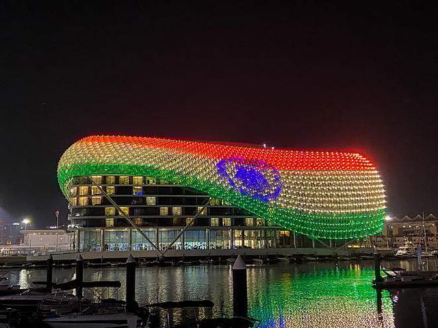 Yas Island at Abu Dubai displays the Indian flag on its grid shell light canopy