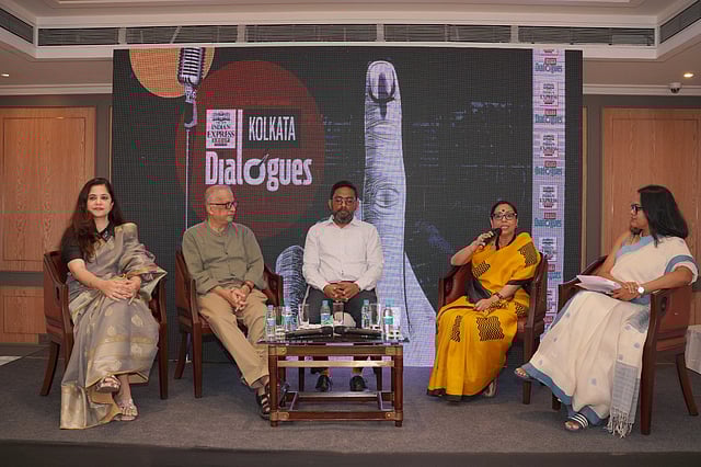 (L to R) CPI (M) South Kolkata candidate Saira Shah Halim, veteran cardiologist and surgeon Dr Kunal Sarkar, professor of political science and political analyst Zaad Mahmood, TNIE Group Editor Santwana Bhattacharya and Deputy Editor, Indulge, Sharmistha Ghosal