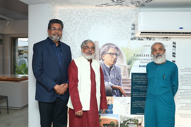 (L-R) Neelkanth Chhaya, Harshavardhan Neotia, and Sohan Nilkanth, at the exhibition