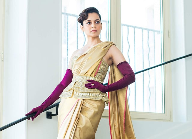 Kangana Ranaut rocks the red carpet at Cannes. She's wearing a Falguni Shane Peacock corset and a Kanjivaram sari by Madhurya Creations. #GreyGooseLife #LiveVictoriously #Cannes2019 #QueenAtCannes