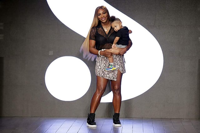 Serena Williams holds her daughter Alexis Olympia Ohanian Jr. after showing her clothing line during New York's Fashion Week in New York, Tuesday, Sept. 10, 2019. (AP Photo/Seth Wenig)