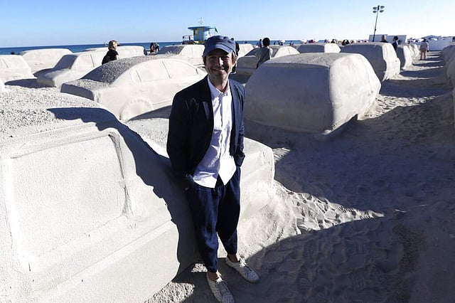 Artist Leandro Erlich of Argentina and his sand sculpture of a traffic jam titled, Order of Importance, at Miami Art Week. The work was commissioned by the city of Miami Beach. (AP Photo/Lynne Sladky)