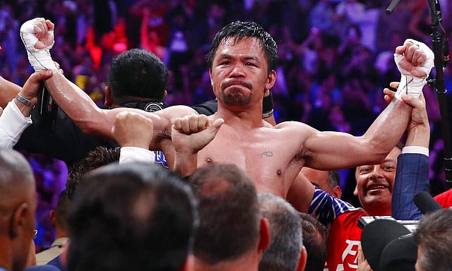 Manny Pacquiao reacts as referee Kenny Bayless holds up his hand signaling his victory over Keith Thurman in a welterweight title fight Saturday, July 20, 2019, in Las Vegas. (AP Photo/John Locher)Manny Pacquiao, right, lands a punch against Keith Thurman in the fifth round during a welterweight title fight Saturday, July 20, 2019, in Las Vegas. (AP Photo/John Locher)Keith Thurman gets up after being knocked down by Manny Pacquiao in the first round during a welterweight title fight Saturday, July 20, 2019, in Las Vegas. (AP Photo/John Locher)Manny Pacquiao, right, and Keith Thurman exchange punches in the second round during a welterweight title fight Saturday, July 20, 2019, in Las Vegas. (AP Photo/John Locher)Manny Pacquiao, reacts after knocking down Keith Thurman in the first round during a welterweight title fight Saturday, July 20, 2019, in Las Vegas. (AP Photo/John Locher)