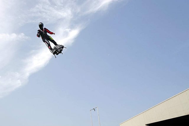 Franky Zapata 'Le Rocketman', a 40-year-old inventor, performs a training flight over the Saint Inglevert airport near Calais, Northern France. (AP Photo/Michel Spingler)