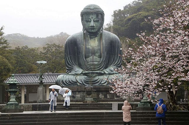People visit the Kotoku-in Temple to see the Big Buddha and cherry blossoms in Kamakura, near Tokyo. (AP Photo/Koji Sasahara)