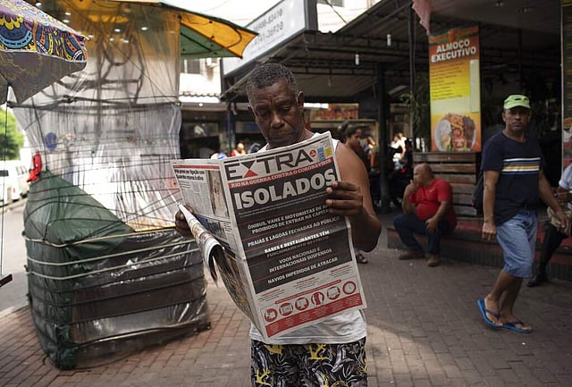 Rio de Janeiro, Brazil: A man reads a newspaper with the Portuguese headline, 'Isolated. Rio in war against coronavirus' in the Rocinha slum of Rio de Janeiro. (AP Photo/Silvia Izquierdo)