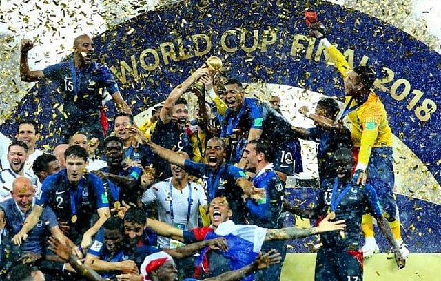 France national team players celebrate after they are handed over the 2018 FIFA World Cup.