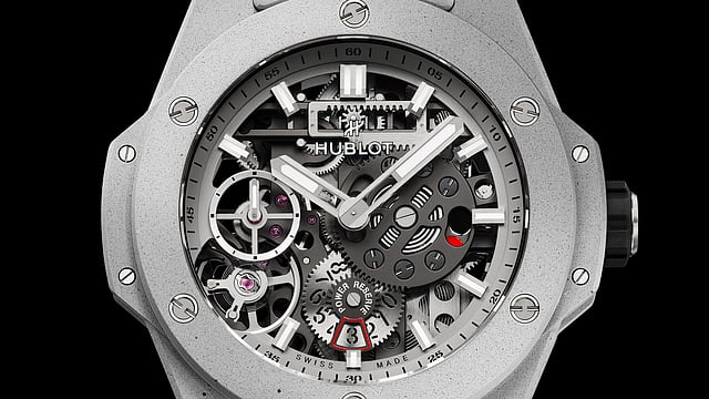 A striking 44mm special edition, the Big Bang MECA-10 Concrete Jungle is encased entirely in matte concrete—an unexpected material rendered here with Hublot’s signature sophistication. The case is framed by H-shaped screws in polished and micro-blasted titanium, with a matching caseback and a satin finished titanium crown over molded with black rubber. Measuring 15.3mm thick and water-resistant to 50 meters, the case is unapologetically bold, mirroring the strength and endurance of the city it was built to honour.