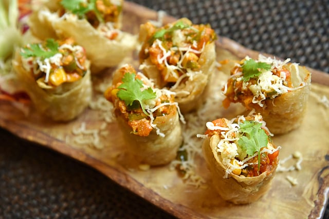 Our next starter, Mini Veg Basket, arrives. The crispy-fried cups are stuffed with a thick gravy of American corn, bell pepper, carrots and beans, making it a delight for any foodie. The Coconut Crispy Chicken is another dish with a dramatic presentation – the bottom of the shooter glass is filled with cocktail sauce and pieces of fried chicken are dipped in it. However, this one is strictly for people who enjoy the flavour of coconut.
