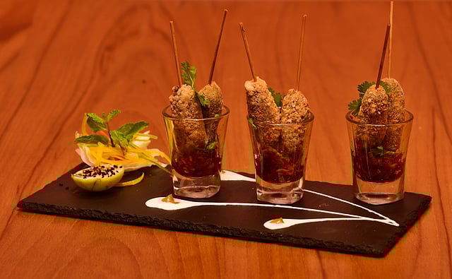 While I wait for executive chef Dharmendra Singh to join me at the table, the gruff serving staff tells me that each meal at this 72-cover space begins with a complimentary mocktail (peru pyala/strawberry collin) and pappads topped with tangy onion-tomato salad. Though the decor is a great mixture of post-modern and rustic elements, I can’t help but notice that the din of the food court outside isn’t drowned out by the Bollywood tunes playing inside the restaurant. It’s a bit of a buzzkill, especially if you’re on a date! However, all that is quickly forgotten as soon as the 30-year-old chef arrives with my starters; crisp vegetable skewers doused in a thick honey chilli sauce and juicy chicken tikka drenched in gooey mozzarella.