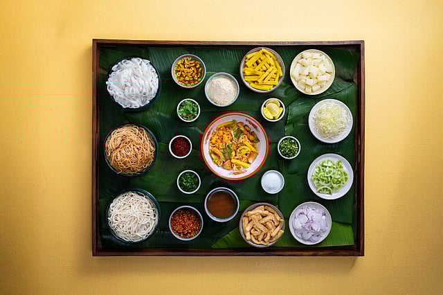 As the pleasant fragrance lingered, we walked around our table to find the Hawker’s noodle basket with a range of noodles, condiments, and sauces. Made with a mix of noodles, chopped onion, tomato, and lemon tossed in chilli oil, turmeric oil and other condiments, the Hawker style noodles topped with coriander, reminded us of a similar Indian counterpart — the Bhel puri with a host of tangy, fresh flavours rendered by the chopped greens and herbs.
