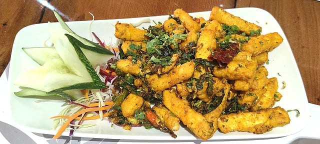 For the appetisers, we had Butter broccoli served with spiced mayonnaise and hot garlic sauce. Deep-fried with a delicate batter coating, each crispy bite carried a dominant yet delightful flavour of garlic and butter. The Chilli paneer — long, thin fingers of soft cottage cheese served with salad — was given a South Indian twist with the addition of curry leaves.