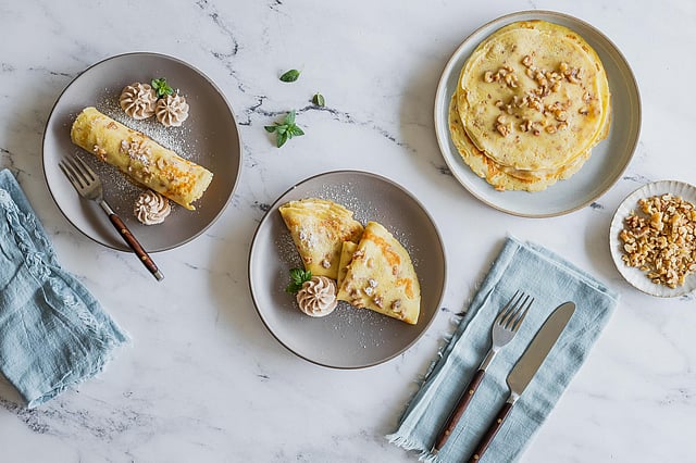 2. Heat an 8-inch nonstick skillet over medium heat and lightly brush with butter. Holding the skillet at a slight angle, pour about 1/4 cup batter into the center of the skillet. Quickly swirl the pan so that the batter evenly coats the bottom. Cook until the edges begin to lift from the skillet, about 30 seconds. Carefully flip the crepe with a spatula and cook on the other side until just set. Slide crepe onto a plate. Repeat with remaining batter, brushing the skillet between each batch.