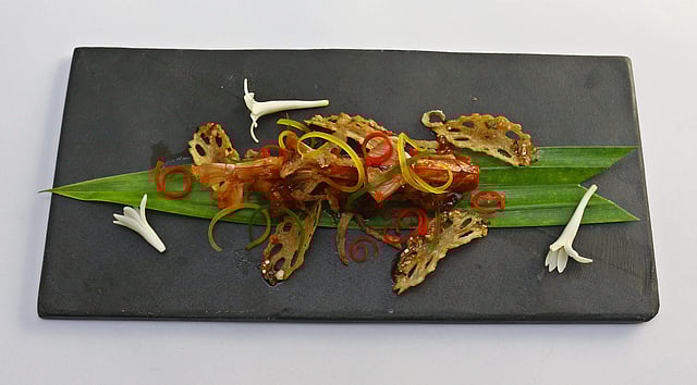 Soon we realise that besides new flavours from the South, chef Satit has also focused on the presentation — and that it is getting prettier with every dish. The Kanom Krok Tai has a bright and colourful garnish — strips of peppers, kernels of sweet corn — and looks like miniature appams. The bite-sized rice pancakes with a topping of coconut cream are delicious. The raw veggie salad Khaek with fried tofu and peanut dressing, presented to us next is an amuse-bouche that prepares us for the flavour heavy Goong Phad Makham. Doused in tamarind and onion sauce the prawns are sweet and tangy — however the lotus stem chips used as garnish steal its thunder. Crunchy and flavoured with lemon grass — no one can eat just one!