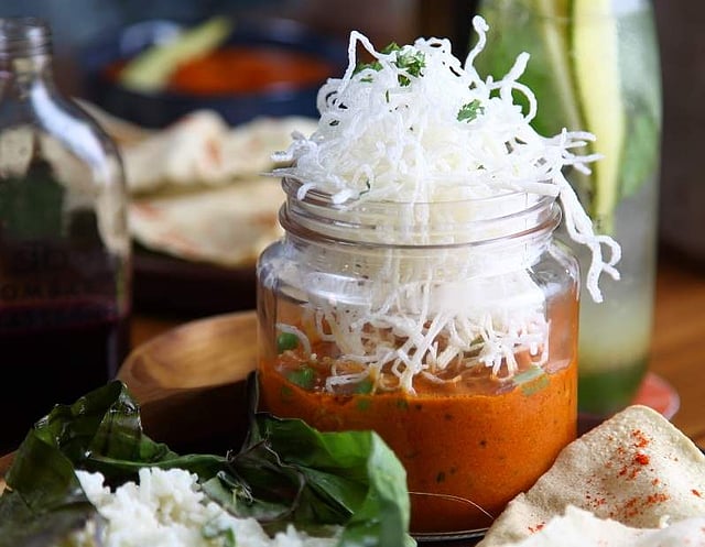 There are Kashmiri Naan Kebabs to be had later (hand-ground mutton mince seekh infused with flavours of kebab chini served on a saffron brushed naan). Even better are the Naga Gosht Pepper Wings flavoured with the famous bhut jolokia chilli. It’s no surprise we rely on the creamy walnut dip for respite, but plough anyway because it has us hooked. There are varied Indian breads to accompany the meaty assemblage before us — buttered romalis, mixed seed rotis and so forth. But we find ourselves drawn to homestyle rice, moist from a coconut milk bath and wrapped in a banana leaf. Had with the Coast to Coast Chicken (our personal favourite in the main course) — is a feel-good combination we would definitely go back for. Curious that we’re unable to grasp any dominant flavour cues to this curry — we ask the chef what the secret is. Turns out,“It is made with a 30-spice Malwani masala from the region!” he responds.
