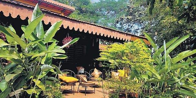 Three bedrooms arrange themselves cleverly across split levels, with multiple entrances to the house, and generous windows bringing the outside inside. “I fell in love with the bungalow when I walked in for the first time,” says owner Ashish Nangia. He has created quaint sit-outs to maximise on the views of the undulating landscape and the hills beyond. There are elevations, with fairy lights coiled inside old glass bottles hanging from the boughs, setting the mood for a relaxed evening while the crickets tune in. Comfortable wicker seats on the front patio, recliners in the space at the back, a wrought iron swing by the tiny pond bring in unending views of the paddy beyond.