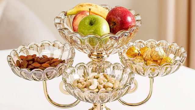 Aditi excitedly tells us about the three must-haves of this collection; Glass 2 Tier Decorative Bowl Stand — a sleek, modern design, with a stand that brings an ethereal elegance to any tabletop, Multilayer Decorative Rotating Glass Bowls Set of 5 — combining functionality with style, a decor piece that allows you to showcase a variety of objects while leaving a lasting impression on guests, and Luxury Floor Candle Holder Set—an elegant way to create warmth in the house.