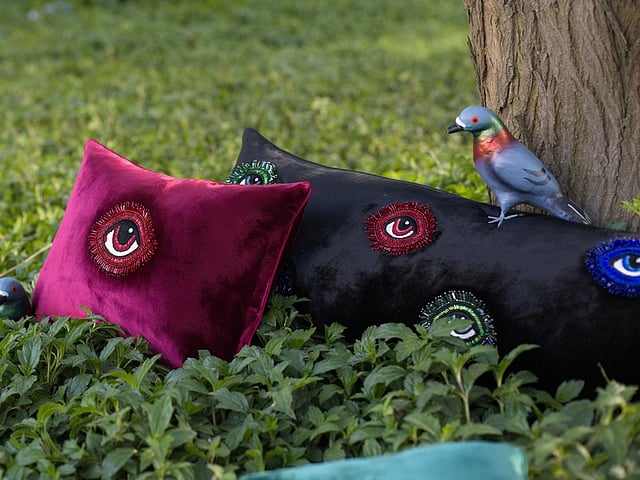 Pomegranates, another dominant motif symbolises prosperity and fertility, while the Shatranj chessboard patterns depict strategy and contemplation. A central theme of the collection — the evil eye motif — can be seen across the products. Alongside it, the Hamsa offers a gentle promise of safeguarding and blessings, while ornamental windows (jharokhas) and garden gates evoke memories of secret stories and hidden dreams. “Design isn’t just about creating beautiful spaces,” explains Raseel. “It’s about filling your home with pieces that speak to your soul.”