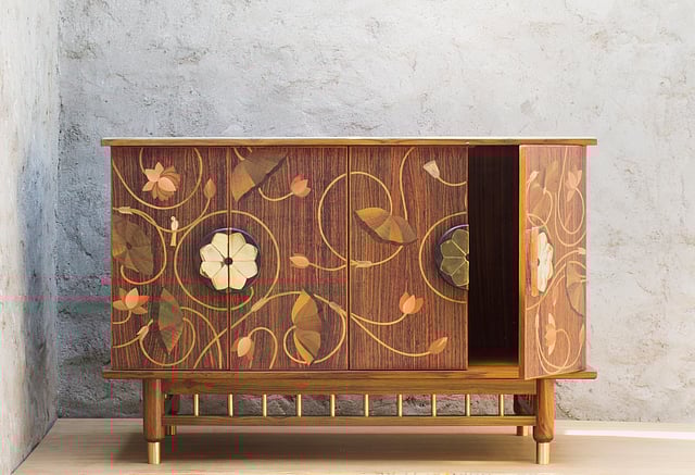 Tanveen got the idea of creating something with wood inlay technique during one of her travels to Mysore right after graduating when she discovered rose-wood inlay. She recognised the potential of this dying craft, and wanted to give it a contemporary touch. This gave birth to Marquetry inlay where they use around 40 types of woods with different colours from locally grown trees. The natural hues of the timber range from whites to grey-blues, yellows to reds, beige to browns.