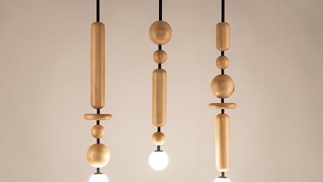 The collection is primarily crafted in wood, with the lamps featuring contrasting metal elements for added structure and sleekness. The difference in textures—light grainy and smooth, exude an interesting touch.