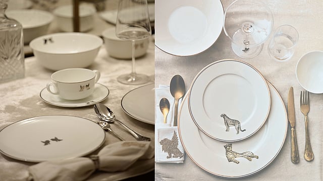 Matsya’s home line translates its signature language—rooted in Indian craft and couture sensibilities—into platinum-detailed dinnerware, crystal glassware, soft furnishings, fine textiles, and statement accessories like silk scarves, handbags, and contemporary jewellery. Each item, from the Michelangelo Arch handbag to the Tales of Masai dinnerware, carries the same thoughtful design ethos as the garments that built the brand.