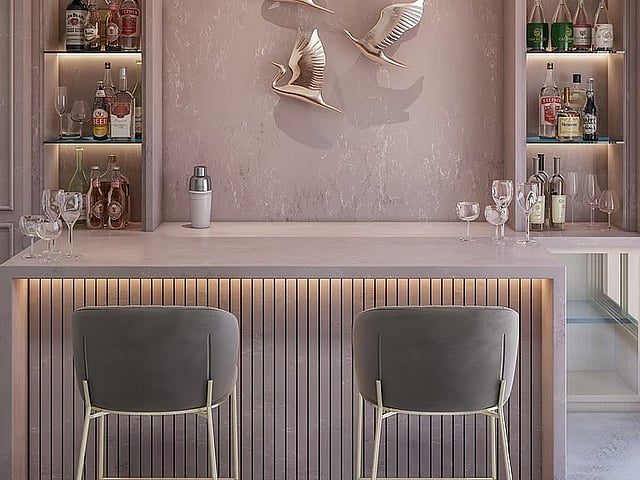 Material and surface finishes are also shaping the identity of modern home bars. Traditionally dominated by shades of black, brown, and white, today’s designs are embracing colour and bold textures. Ankit Jain, founder of Specta Quartz Surfaces, explains, “Homeowners are experimenting with pastel-coloured surfaces that add a chic, approachable vibe, or choosing dramatic veined quartz stones to create statement backdrops. At Specta, our ‘Pastel Poise’ collection featuring shades like lavender and mint green has been especially popular for home bars. For those seeking a luxe lounge feel, pairing bold quartz veining with mood lighting instantly sets the tone, while warm wood accents deliver rustic tavern-inspired charm. And for versatility, many homeowners use the same setup as a coffee bar when hosting teetotalers.”
