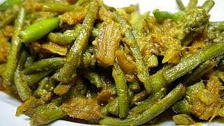 Peel the skin of ridged gourd and cut into small pieces. Dry grind the poppy seeds. Clean the prawns and apply turmeric and salt on them. Fry them slightly and keep aside. Heat mustard oil in a pan. Add panch phoran for tempering. Add chopped onion and slit green chilli. Add sugar and cook till the onions turn pinkish brown and translucent. Fry with little turmeric till the potatoes are light golden in colour. Add chopped ridged gourd and fry for a couple of minutes. Add salt and red chilli powder. Cover and let the ridged gourd cook for a while. While the ridged gourd is still cooking in its own juices, add the poppy seed powder and add a little water if required. Once the vegetables are done, add the shrimp, wilted turmeric leaf and mix. Top with half tsp of mustard oil.