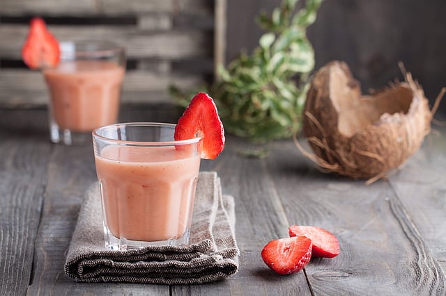 1 cup almond milk or coconut milk | 1 cup fresh or frozen strawberries | Half a banana fresh or frozen | 1 tbsp cold-pressed virgin coconut oil