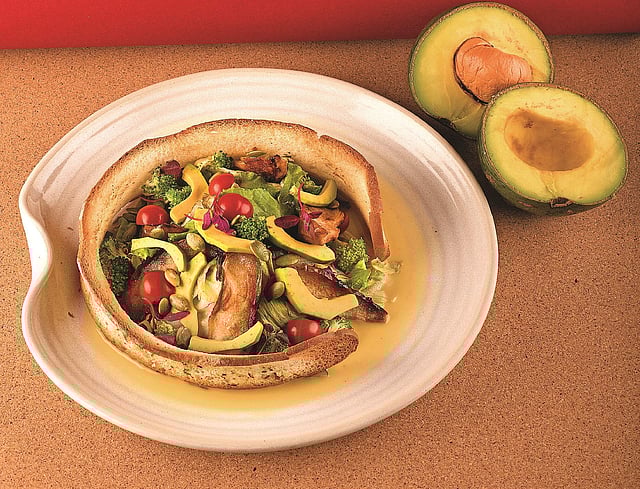 Mixed lettuce 120 gms | Cherry tomato (halves) 60 gms | Green olives 25 gms | Orange segments 20 gms | Broccoli florets 80 gms | Pears slices 80 gms | Avocado slices 50 gms | Toasted Sunflower seeds 10 gms | Toasted Pumpkin seeds 10 gms | Passion fruit emulsion 75 gms