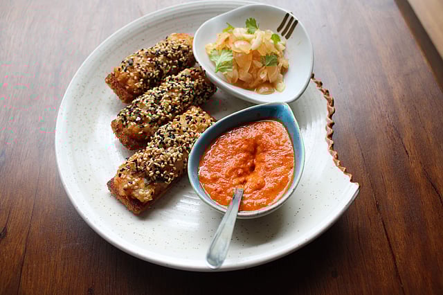 -Once this is done, serve with sweet chili onion pickle and chili garlic sauce.