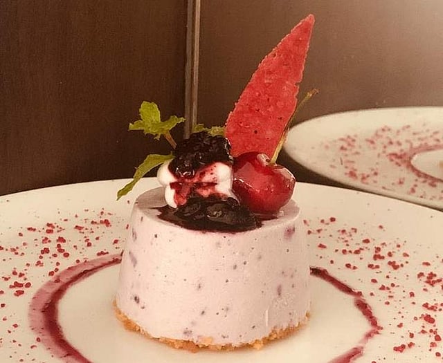 Remove it out, demould the Cheesecake garnish and serve with blueberry compote, whipped cream, crumble, fresh cherry and brandy snap.