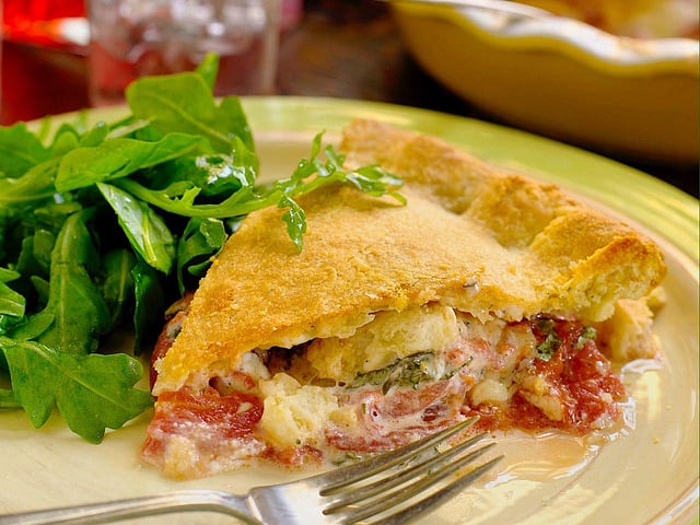 As the chef describes it, a thin biscuit-style crust props up two pounds of ripe and juicy Roma tomatoes that are cushioned within a base of sharp aged cheddar and a combination of fresh and dried herbs. The tart is deceptive —while it appears fancy and sophisticated, it couldn’t be easier to make, being no more difficult than any rustic-style pie. He gives us a tip,"I often add harissa to the mayonnaise base to give the pie a spiciness that works really well with the sweetness of the tomatoes." As for following the recipe to a tee, he recalls, "Mary insists that the pie is best made the night before you plan on serving it and then reheating the cooked pie in a 50°F/180°C/gas 4 oven for 30 minutes."