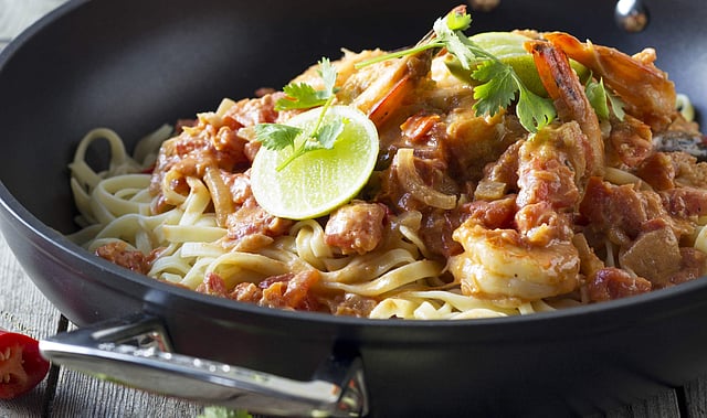 6. Add the cooked linguine to the sauce and combine making sure all the pasta is well coated. Heat through until piping hot and serve garnished with the roughly chopped coriander leaves.