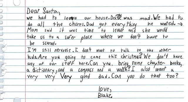 The shelter, SafeHaven of Tarrant County, took to Facebook to share an image of the letter written by the little boy captioned, "Blake is a 7-year-old boy in one of our shelters, and his mom found this letter to Santa in his backpack a few weeks ago."