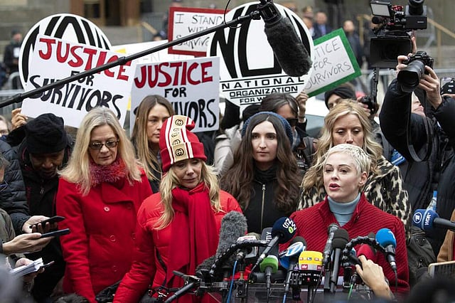 “For once he won’t be sitting comfortably,” said actress Rose McGowan, one of Weinstein's earliest accusers. “For once, he will know what’s it's like to have power wrapped around his neck.”