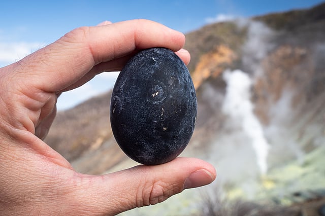 Originally resembling a regular chicken egg, these eggs gradually turn black when boiled in natural hot spring water rich in sulphur and iron. As the eggshells react with the minerals in the springs, iron sulphide forms, giving the eggs their deep, jet-black colour, although the yolk and egg white remains unchanged.