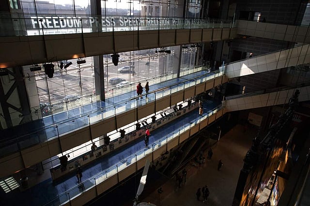 Sitting almost equidistant between the White House and the Capitol on Pennsylvania Avenue, the glass-walled building became instantly recognizable for its multi-story exterior rendition of the First Amendment.