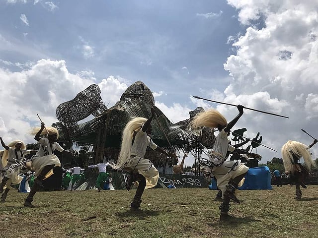 A giant gorilla frame made of bamboo with an infant riding on its back served as the backdrop for performances by cultural troupes and South African pop duo Mafikizolo.