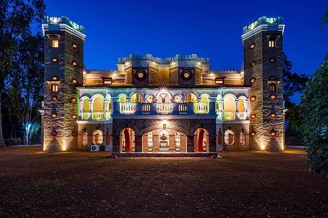 Located in Panna, Madhya Pradesh, the property is owned by the royal Ju Deo family. It was built by Lt Col Raja Bhartendra Singh Ju Deo a century ago. Raja Bhartendra had a love for traveling and it was during a visit to Windsor Castle in England that he felt inspired to take cues from the castle for the design of his own home. The palace was built entirely from Panna sandstone and lime mix. Also on the property are two man-made water bodies where guests can try their hands at fishing. A horse stable with a few horses is another feature.