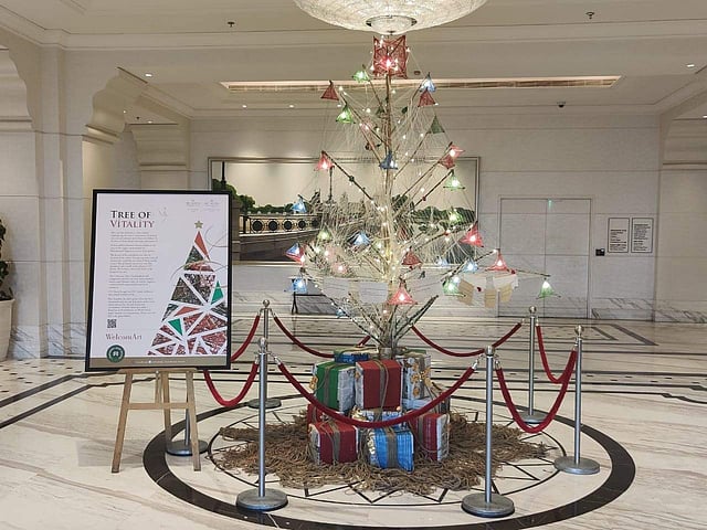 The Tree of Vitality is handcrafted with indigenous resources by Kolkata artists Shailpik Biswas & Paramita Saha, and its artistic elegance celebrates life and sustainability. Inspired by Rabindranath Tagore's poems that have immortalised nature inculcating it through a generic cultural framework, this tree resonates with ITC Hotel's Responsible Luxury.
