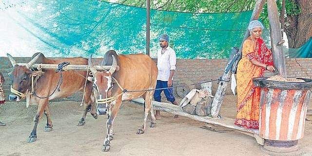 The sight of big bulls yoked to a pestle churning out oil is a pastoral sight as old as karma. It is also part of an ancient Indian village tradition, which is making a return due to the growing demand for pure oils. Arogya Dayani, founded and run by 54 year-old Kotla Jayamma in the Telangana village of Jaklapally in Mahbubnagar district, manufactures cold-pressed oils such as groundnut, sesame, safflower and coconut, for both India, Singapore and the Middle-East. The difference between Arogya Dayani and businesses set up by degree-wielding entrepreneurs is Jayamma’s background. She grew up in a farming family in Hanumanpally village, and was then married off young into a family that owned a dairy farm.