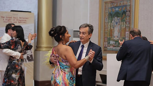 With the party under way, Patricia Loison began to waltz. And as was proper, one of the first dances of the director of Alliance Française de Delhi (AFD) was with Thierry Mathou, the French ambassador to India. Both were in French colours -- blue, white, and red; in her off-shoulder dress, Loison moved gracefully under the chandelier before Pichwai paintings. A pièce montée cake installation at the other end of the ballroom, a violinist in all black, a poster of earlier versions of cultural evenings in Delhi, plates of macaroons with honey and goat cheese plus other savouries by L’Opera on little tables beside the bar—all played their part in evoking the ’50s ‘French Ball’ that Loison had re-ushered into Delhi a few weeks ago, just as summer grew in the city.
