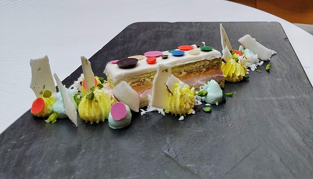 ● In a well-greased cake ring, line a thin layer of coconut sponge. ● Add the pistachio cremeux and spread evenly across the sponge and freeze till set. ● Pour the saffron cream and spread it evenly and freeze again. ● Spread the rose ganache and set in the cake ring. ● Once set, pour the coconut glaze and cut into slices and serve.