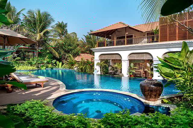 The pair of exceptionally luxurious suites dotting this property, namely The Wabi Sabi Suite and The Bauhinia Suite, exude opulence balanced with refinement throughout the spacious walk-in wardrobes to the spa-inspired en-suites equipped with the finest designer toiletries. Expansive, sunlit verandas grace the suites, providing a panoramic view of the dazzling pool and magnificent garden. The veranda is ideal for basking in the afternoon sun, and there's also the option to indulge in a refreshing swim in the lagoon-like pool, complete with a wading pool and a comforting warm-water jacuzzi. Three separate villas, influenced by Balinese and Mediterranean aesthetics, overlook the pool. One of these villas boasts its own plunge pool, while the other two enjoy the tranquility of a private garden. At the heart of the main house lies a courtyard, featuring an ancient frangipani tree that encourages one to slow down and fully immerse themselves in the luxury offered by this North Goa villa.