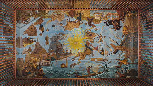 Now comes the star of the palace, the fresco, Utkala (utkala means Odisha in Odia). Done by a young, self-taught artist Guru Vinayak Singh, the painting is a visual epic that traces Odisha’s journey through mythology, the Mahabharata, and the Kalinga War. The result of 7,000 hours of meticulous labour — 13 hours a day — and hundreds of calls with historians overseas, Utkala was shaped by research, rigour, and the quiet devotion it takes to paint five millennia into stillness.