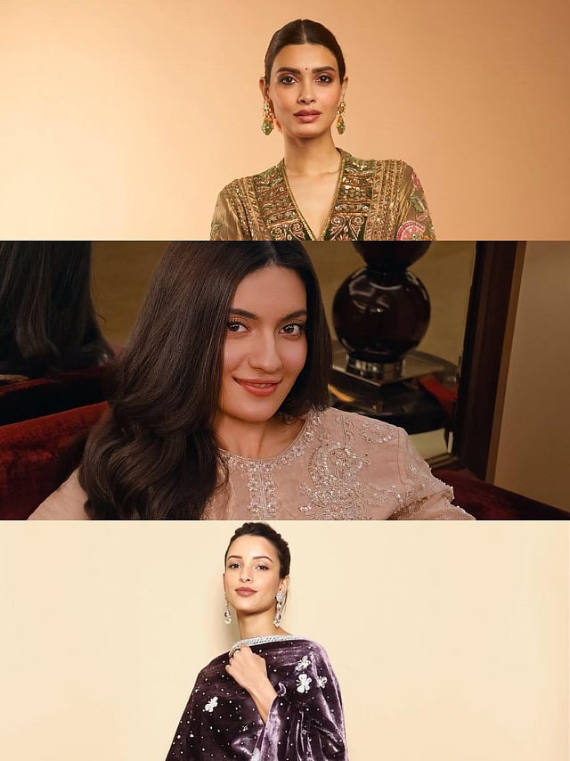 Divya Khossla embraces royal charm in a light blue Anarkali with golden borders and floral motifs. She keeps it minimal with jewellery, letting her outfit shine in all its glory.