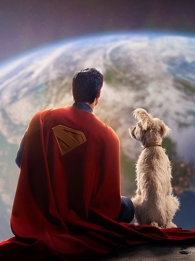 He sports a red cape with the ‘S’ symbol and a dog collar with a miniature ‘S’ sticking out