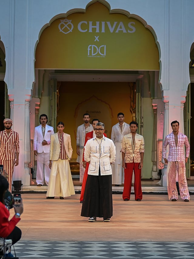 The collection reimagines traditional South Indian elements, like the wisdom of Thirukkurals and Madras checks, into contemporary menswear silhouettes such as structured jackets, fluid palazzos, and draped kurtas.