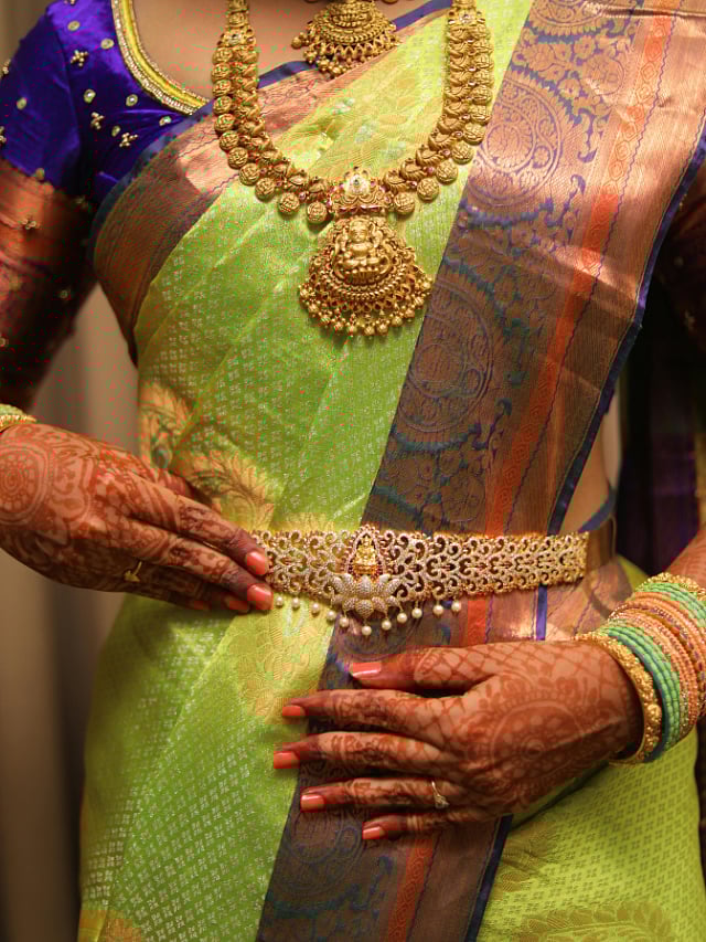 Who says sari belts are only meant for a sari? Slay it with a lehenga as Janhvi Kapoor does it with this heavy-work belt that keeps her dupatta in place.