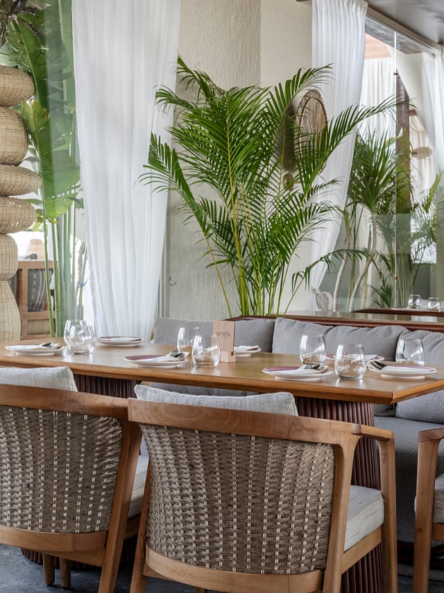 The restaurant interiors span two floors with indoor plants, custom furniture, artisanal texture and lighting designed by Minnie Bhatt to give off comfortable luxury vibes